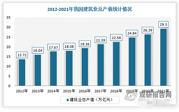 根據(jù)觀研報(bào)告網(wǎng)發(fā)布的《中國(guó)塑料異型材行業(yè)現(xiàn)狀深度調(diào)研與發(fā)展前景分析報(bào)告(2023-2030年)》顯示,在建筑領(lǐng)域,建筑作為國(guó)民經(jīng)濟(jì)支柱產(chǎn)業(yè),占國(guó)內(nèi)生產(chǎn)總值的比例始終保持在6.5%以上,截止2021年全年全國(guó)實(shí)現(xiàn)建筑業(yè)增加值8萬(wàn)億元,占國(guó)內(nèi)生產(chǎn)總值的7%。同時(shí),建筑業(yè)總產(chǎn)值呈逐年增長(zhǎng)態(tài)勢(shì),截止2021年底中國(guó)建筑業(yè)總產(chǎn)值達(dá)到29.3萬(wàn)億元,2013-2021年年均增長(zhǎng)8.8%。由此可見,我國(guó)塑料異型材行業(yè)需求或?qū)⒊掷m(xù)保持上升。